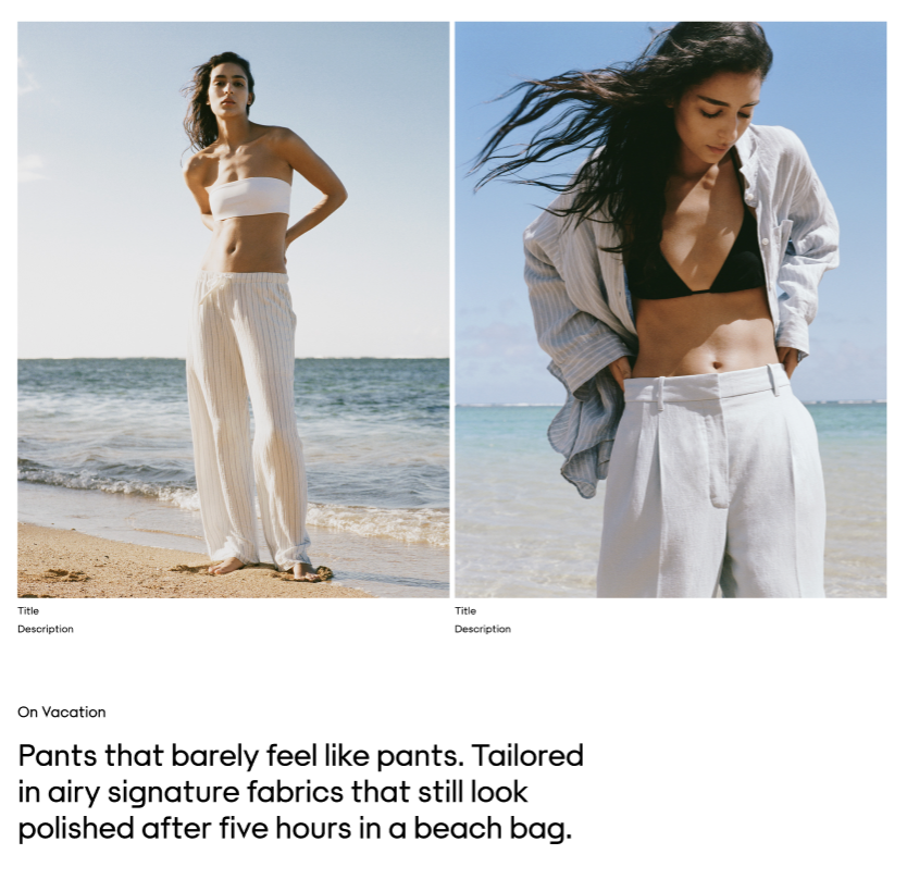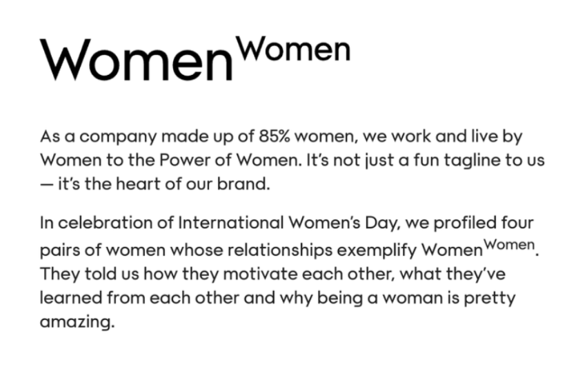 Women to the Power of Women was one of the first campaign taglines I wrote at Aritzia (it made history as the company’s first math-related slogan). The tagline has seen been incorporated into Aritzia’s year-round branding.